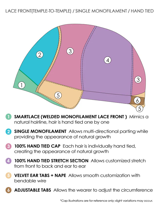 • Cap Design: Lace Front (Temple-to-Temple) | Single Monofilament | Hand-Tied